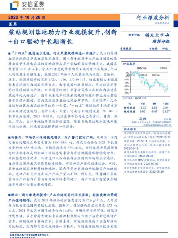 【安信证券】【20221026】医药行业深度分析:浆站规划落地助力行业规模提升,创新+出口驱动中长期增长-51页 行业研究