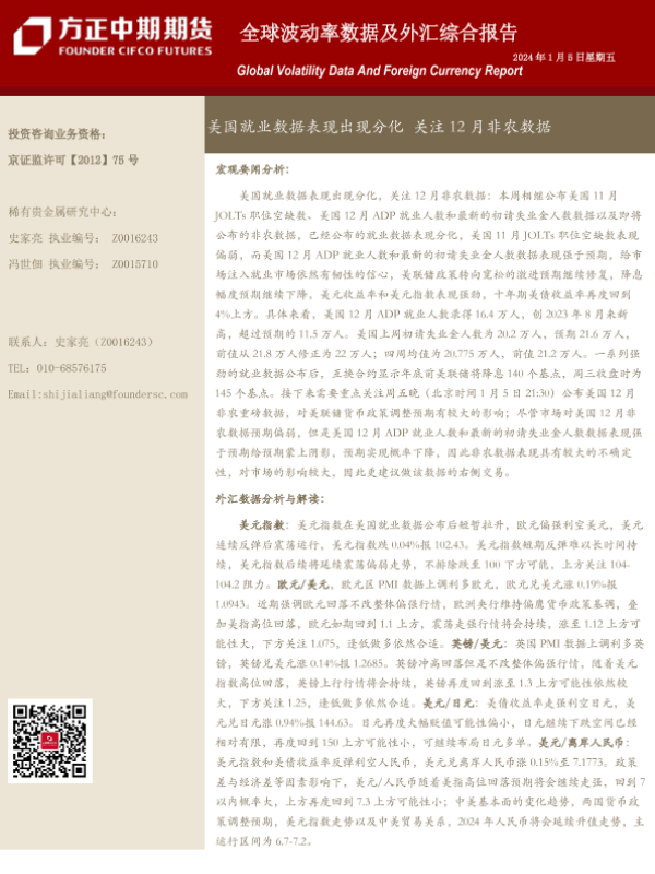 【方正中期期货】【20240105】全球波动率数据及外汇综合报告:美国就业数据表现出现分化 关注12月非农数据-18页 行业研究