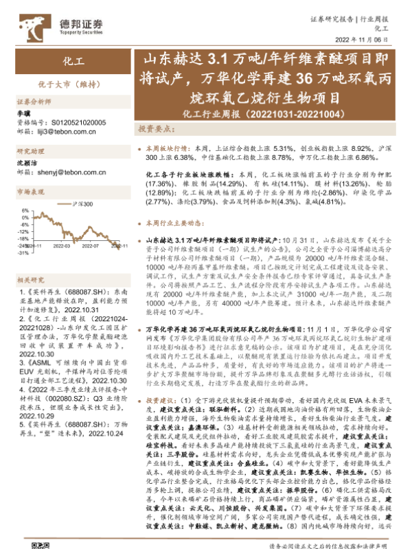 【德邦证券】【20221106】化工行业周报:山东赫达3.1万吨年纤维素醚项目即将试产,万华化学再建36万吨环氧丙烷环氧乙烷衍生物项目-25页 行业研究