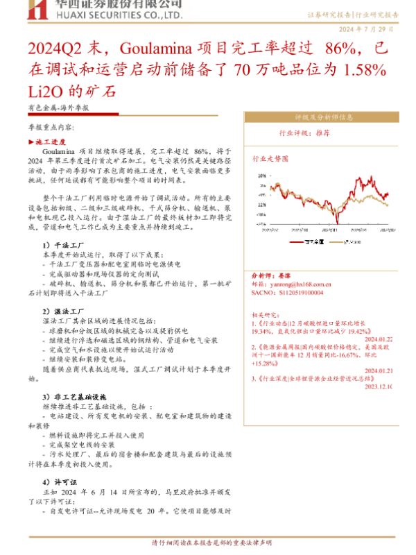 【华西证券】【20240729】有色金属行业-海外季报:2024Q2末,Goulamina项目完工率超过86%,已在调试和运营启动前储备了70万吨品位为1.58%Li2O的矿石-11页 行业研究