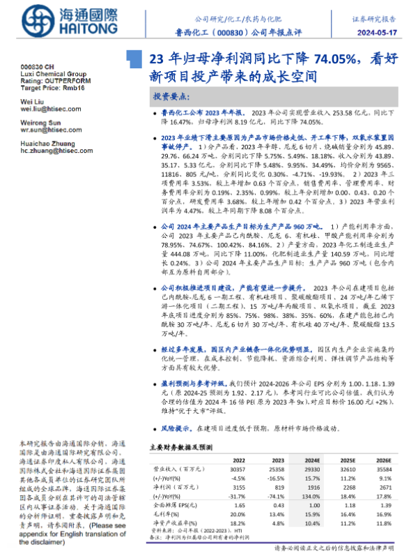 【海通国际】【20240516】鲁西化工-000830.SZ-公司年报点评:23年归母净利润同比下降74.05%,看好新项目投产带来的成长空间-11页 行业研究