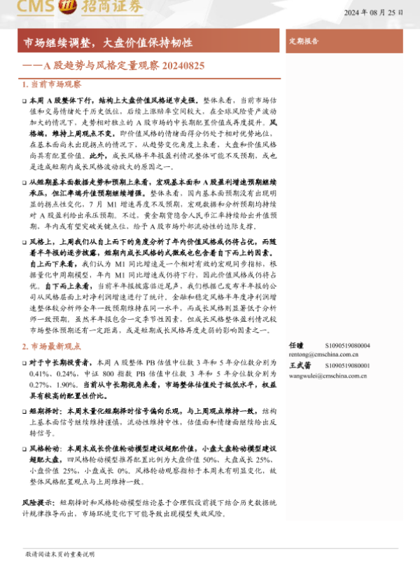 【海通证券】【20240825】A股趋势与风格定量观察:市场继续调整,大盘价值保持韧性-11页 行业研究