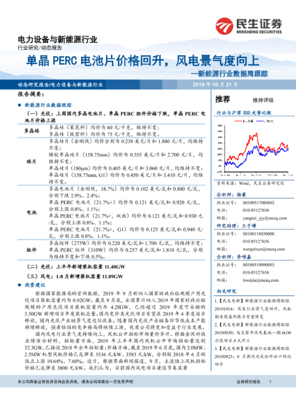 【民生证券】【20191021】20191021-民生证券-新能源行业数据周跟踪:单晶PERC电池片价格回升,风电景气度向上-10页 行业研究