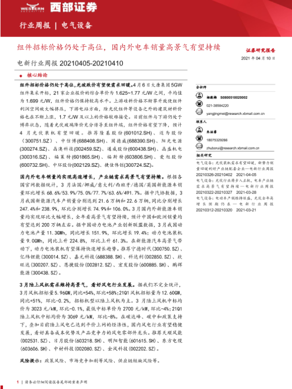 【西部证券】【20210410】电新行业周报:组件招标价格仍处于高位,国内外电车销量高景气有望持续-14页 行业研究