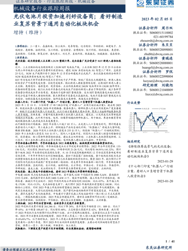 【东吴证券】【20230205】机械设备行业跟踪周报:光伏电池片投资加速利好设备商;看好制造业复苏背景下通用自动化板块机会-41页 行业研究