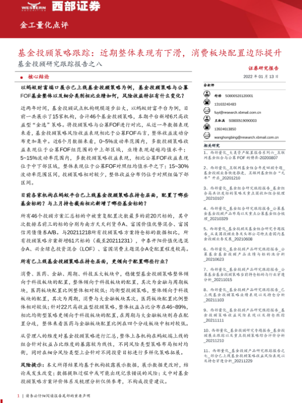 【西部证券】【20220113】基金投顾研究跟踪报告之八:基金投顾策略跟踪,近期整体表现有下滑,消费板块配置边际提升-17页 行业研究