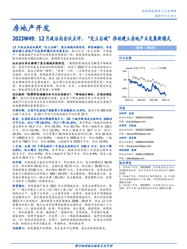 【国盛证券】【20231210】房地产开发2023W49:12月政治局会议点评,“先立后破”推动建立房地产业发展新模式-15页 行业研究