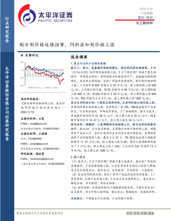 【太平洋证券】【20240325】20240325-太平洋-化工新材料行业周报:制冷剂价格延续强势,饲料添加剂价格上涨-29页 行业研究