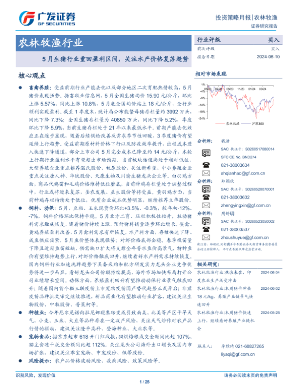 【广发证券】【20240610】20240610-广发证券-农林牧渔行业投资策略月报:5月生猪行业重回盈利区间,关注水产价格复苏趋势-25页 行业研究