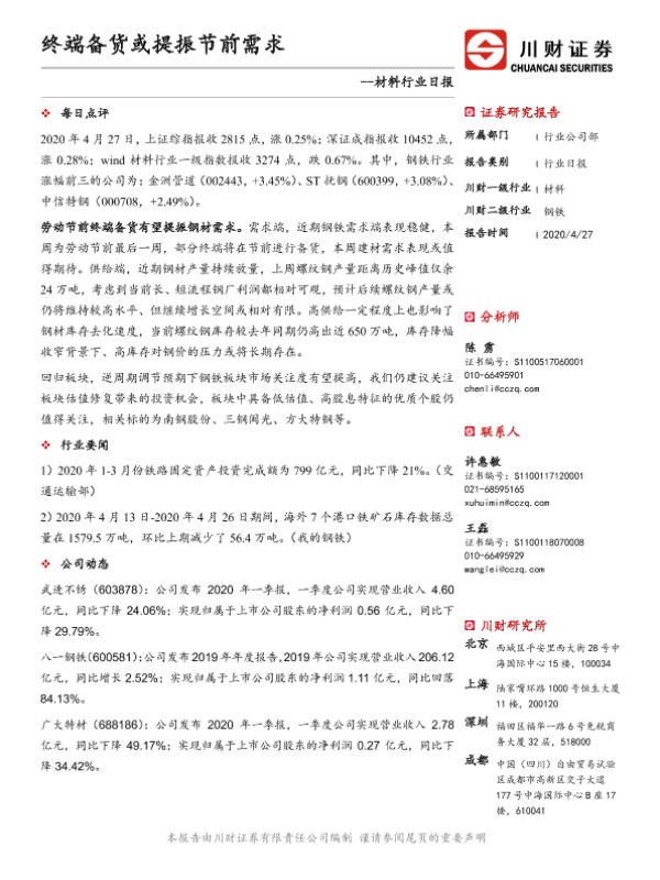 【川财证券】【20200427】材料行业日报:终端备货或提振节前需求-3页 证券期货研究报告