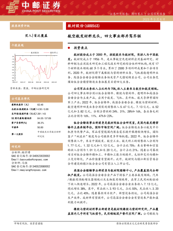 【中邮证券】【20230906】航材股份-航空航发材料龙头,四大事业部并驾齐驱-46页 行业研究