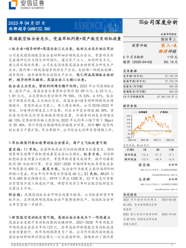 【安信证券】【20230407】西部超导-高端航空钛合金龙头,受益军机列装+国产航空发动机放量-31页 行业研究