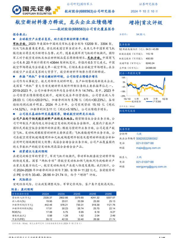 【国元证券】【20241010】航材股份(688563)首次覆盖报告:航空新材料潜力释放,龙头企业业绩稳增-44页 行业研究