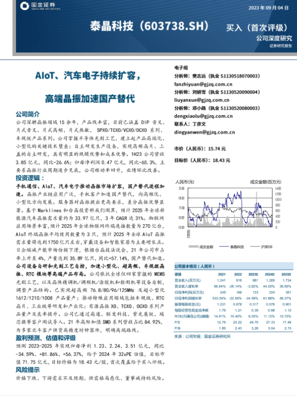 【国金证券】【20230904】深度报告-20230904-国金证券-泰晶科技-603738.SH-AIoT_汽车电子持续扩容_高端晶振加速国产替代-22页 行业研究