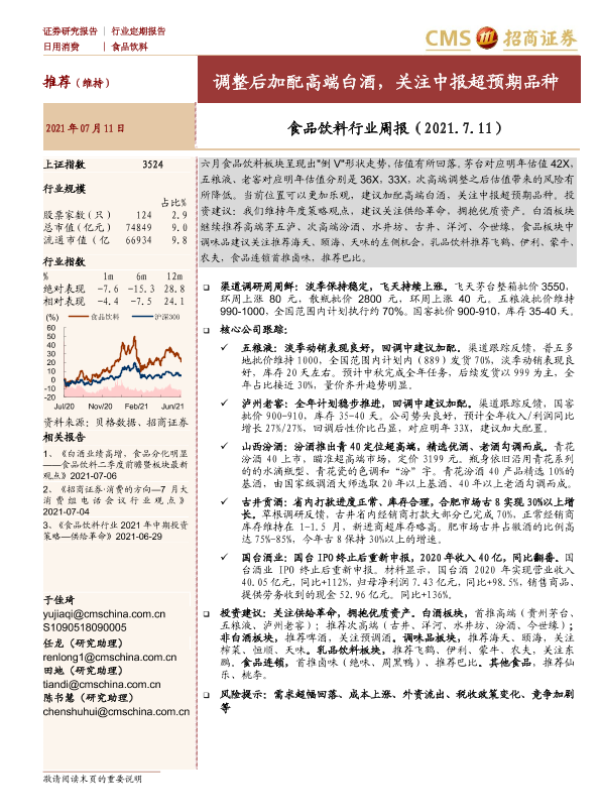 【海通证券】【20210711】食品饮料行业周报:调整后加配高端白酒,关注中报超预期品种-7页 行业研究