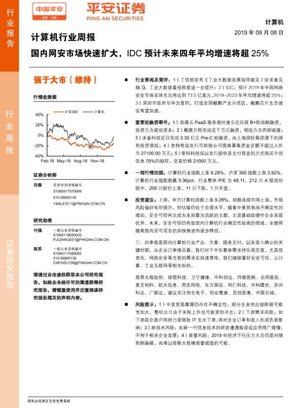 【平安证券】【20190908】计算机行业周报:国内网安市场快速扩大,IDC预计未来四年平均增速将超25%-5页 行业研究