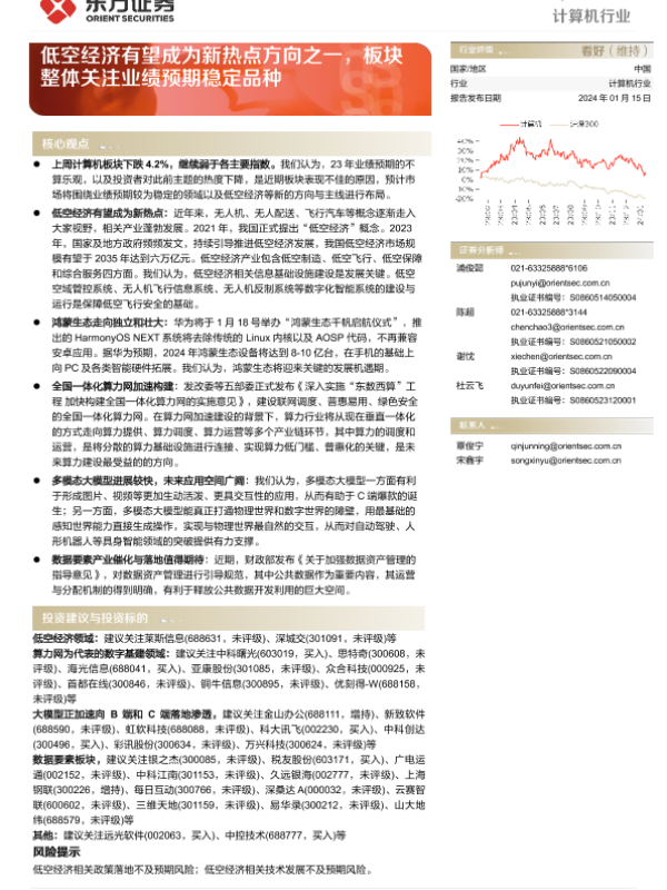 【东方证券】【20240115】计算机行业周报:低空经济有望成为新热点方向之一,板块整体关注业绩预期稳定品种-12页 行业研究