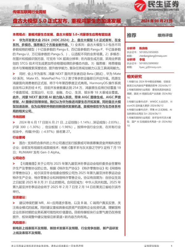 【民生证券】【20240623】传媒互联网行业周报:盘古大模型5.0正式发布,重视鸿蒙生态加速发展-17页 行业研究