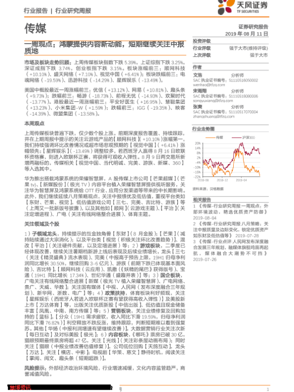 【天风证券】【20190811】传媒一周观点:鸿蒙提供内容新动能,短期继续关注中报质地-24页 行业研究