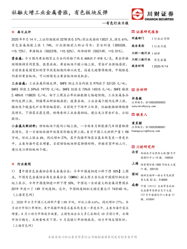 【川财证券】【20200914】有色行业日报:社融大增工业金属普涨,有色板块反弹-3页 证券期货研究报告