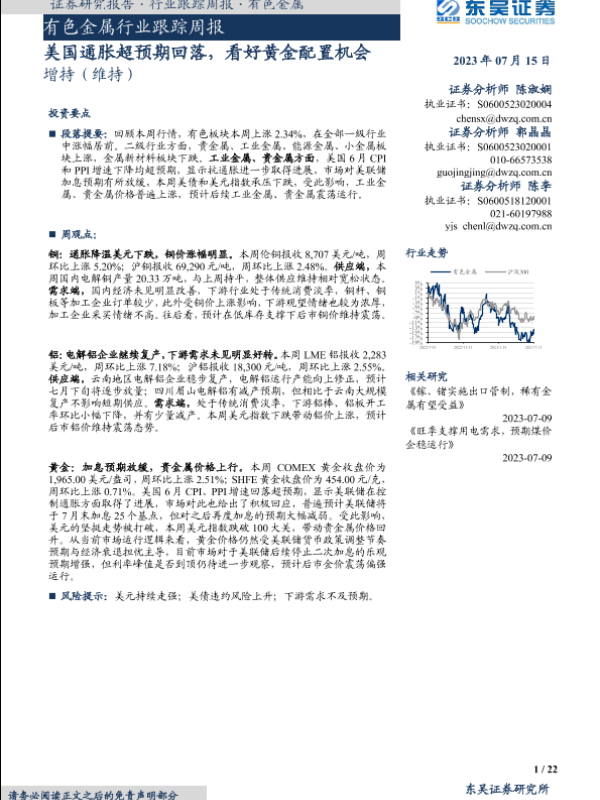 【东吴证券】【20230715】有色金属行业跟踪周报:美国通胀超预期回落,看好黄金配置机会-22页 行业研究