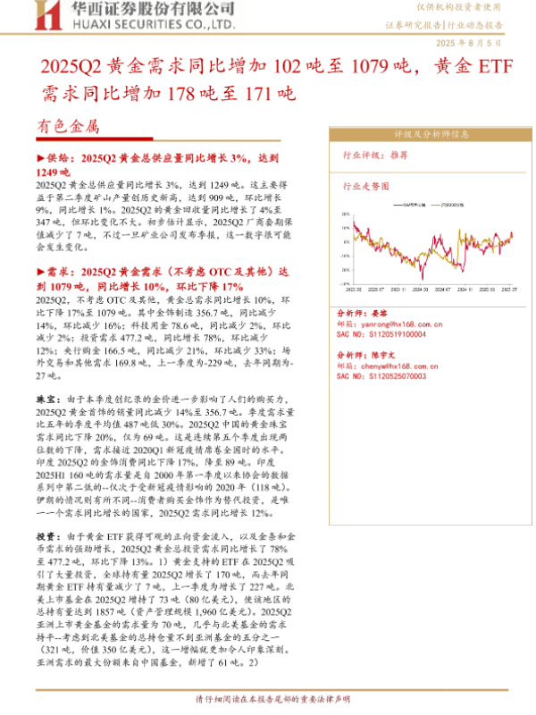【华西证券】【20250805】2025Q2黄金需求同比增加102吨至1079吨,黄金ETF需求同比增加178吨至171吨-19页 证券期货研究报告