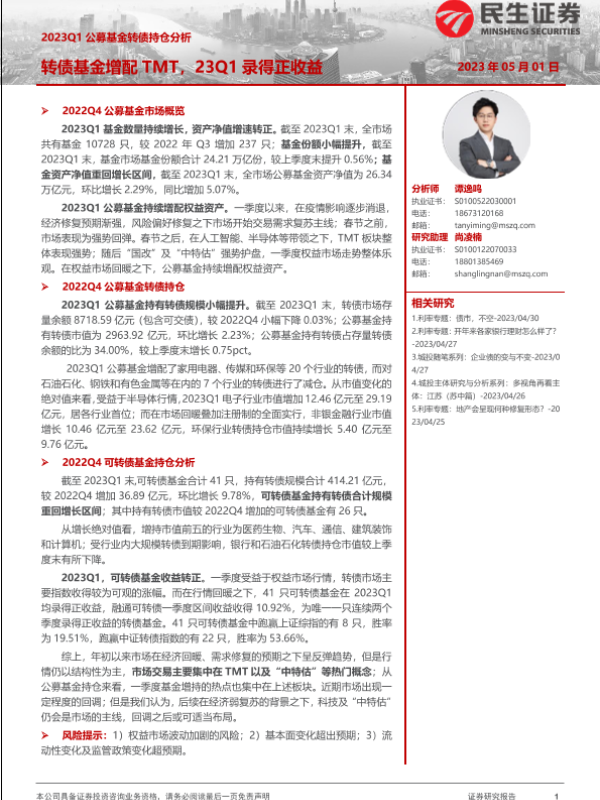 【民生证券】【20230501】2023Q1公募基金转债持仓分析:转债基金增配TMT,23Q1录得正收益-20页 行业研究