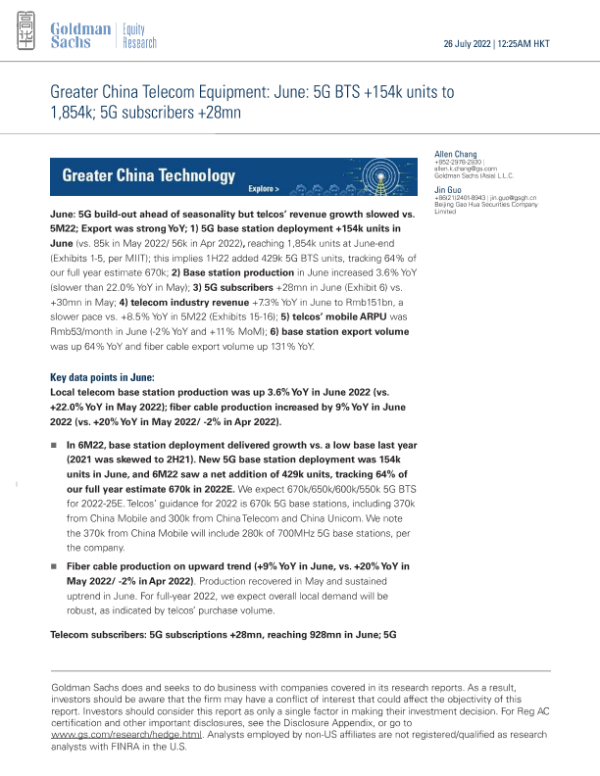 【Goldman Sachs】【202206】lecom Equipment_ June_ 5G BTS +154k units to 1,854k; 5G subscribers +28mn-10页 行业研究