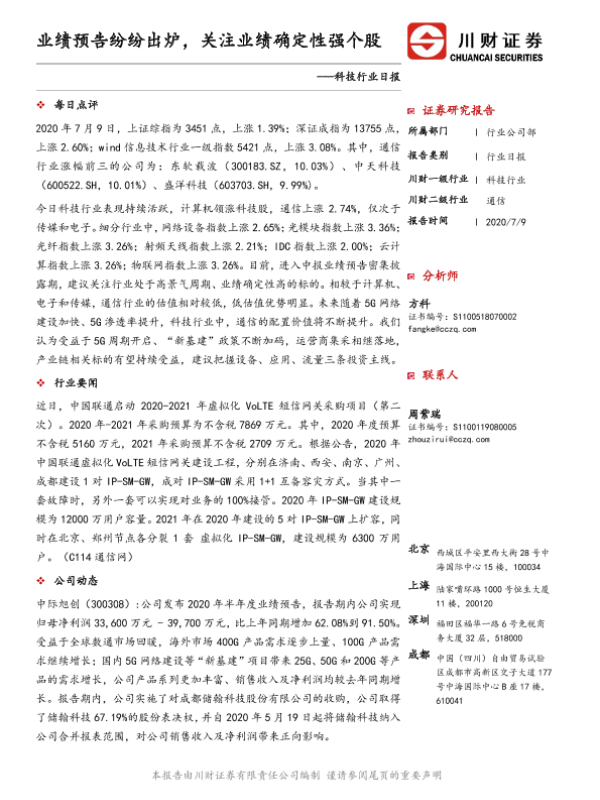 【川财证券】【20200709】科技行业日报:业绩预告纷纷出炉,关注业绩确定性强个股-4页 证券期货研究报告