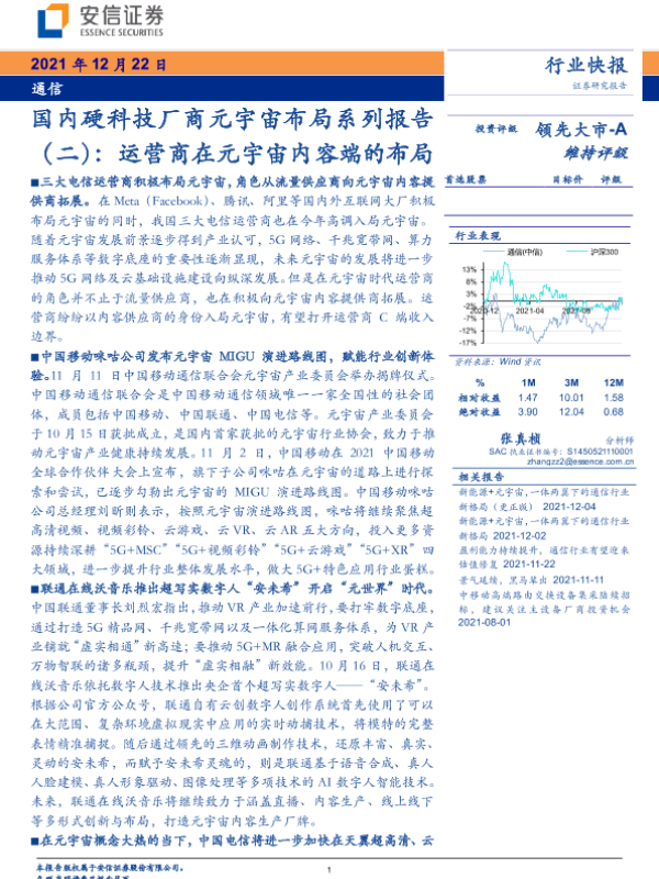 【安信证券】【20211222】国内硬科技厂商元宇宙布局系列报告(二):运营商在元宇宙内容端的布局-4页 行业研究