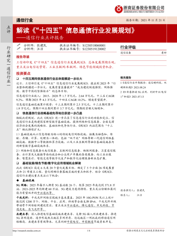 【浙商证券】【20211121】20211121-浙商证券-通信行业点评报告:解读《“十四五”信息通信行业发展规划》-4页 行业研究