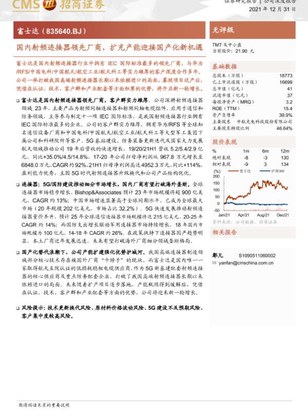 【海通证券】【20211231】国内射频连接器领先厂商,扩充产能迎接国产化新机遇-19页 公司研究