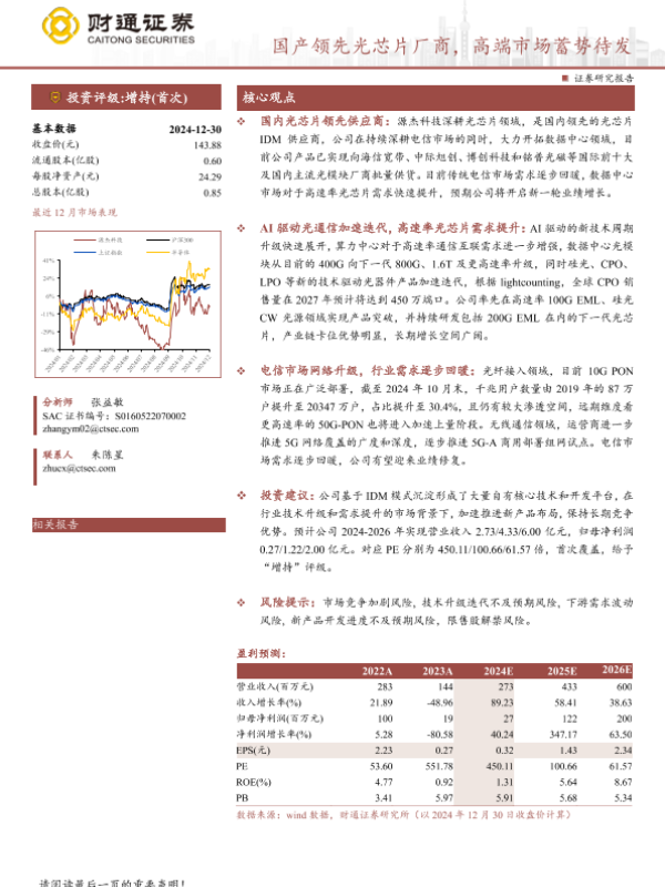 【财通证券】【20241230】源杰科技(688498)国产领先光芯片厂商,高端市场蓄势待发-30页 行业研究