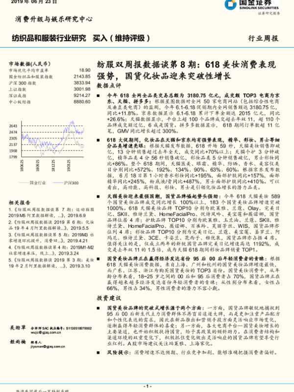 【国金证券】【20190623】纺服双周报数据谈第8期:618美妆消费表现强势,国货化妆品迎来突破性增长-9页 行业研究