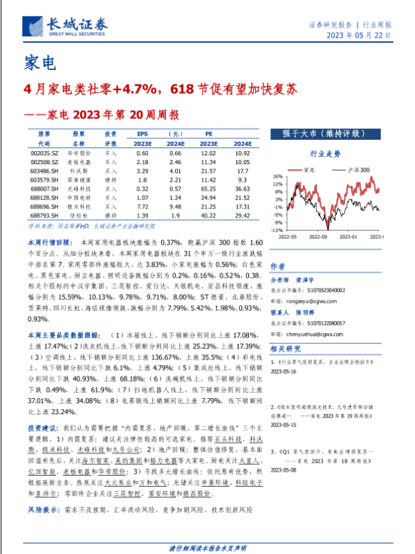 【长城证券】【20230522】家电2023年第20周周报:4月家电类社零+4.7%,618节促有望加快复苏-26页 行业研究