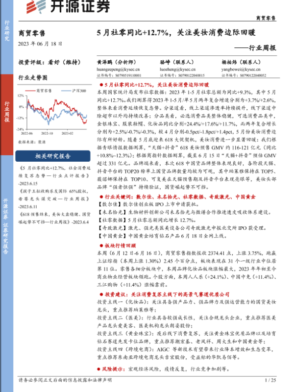 【开源证券】【20230618】商贸零售行业周报:5月社零同比+127%,关注美妆消费边际回暖-25页 行业研究