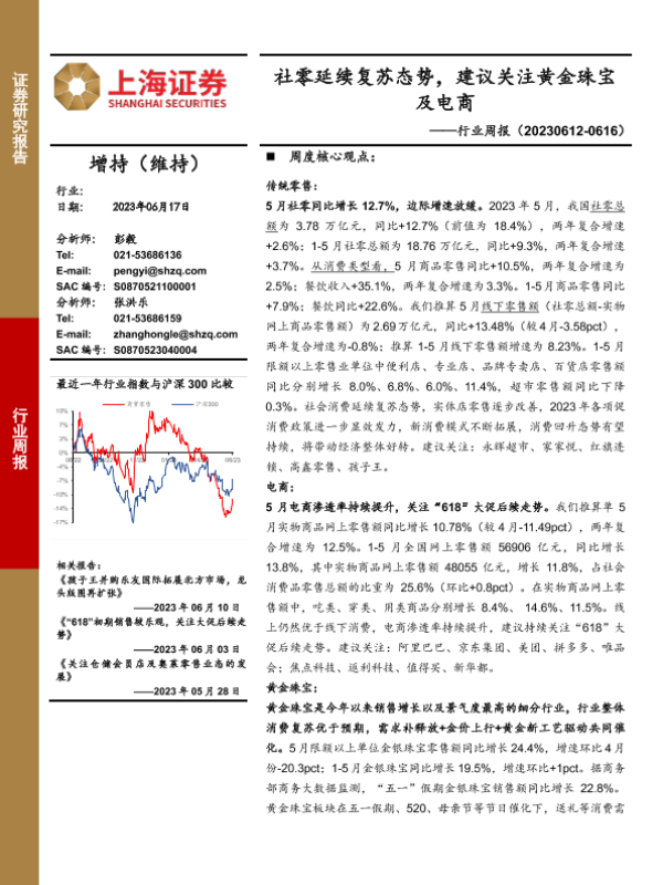 【上海证券】【20230617】商贸零售行业周报:社零延续复苏态势,建议关注黄金珠宝及电商-12页 行业研究