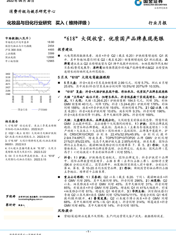 【国金证券】【20220630】化妆品与日化行业月报:“618”大促收官,优质国产品牌表现亮眼-16页 行业研究