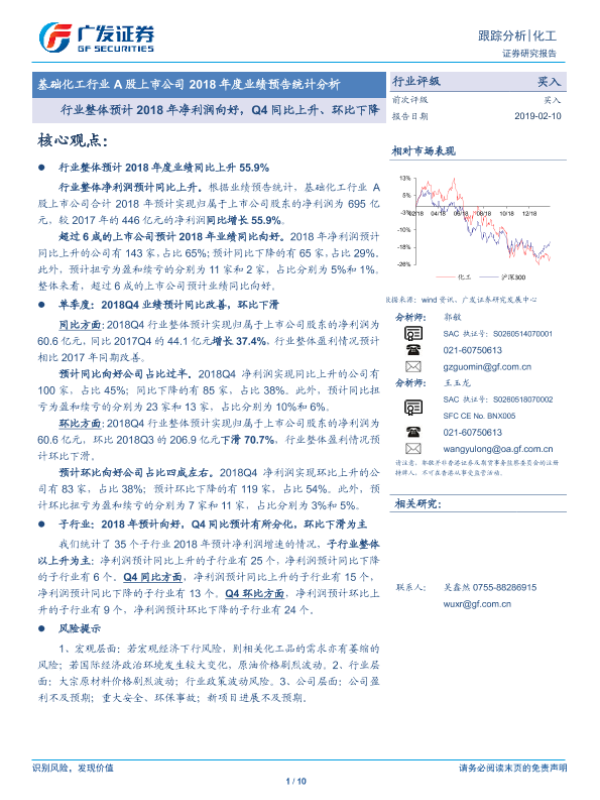 【广发证券】【20190210】基础化工行业A股上市公司2018年度业绩预告统计分析:行业整体预计2018年净利润向好,Q4同比上升、环比下降-10页 行业研究