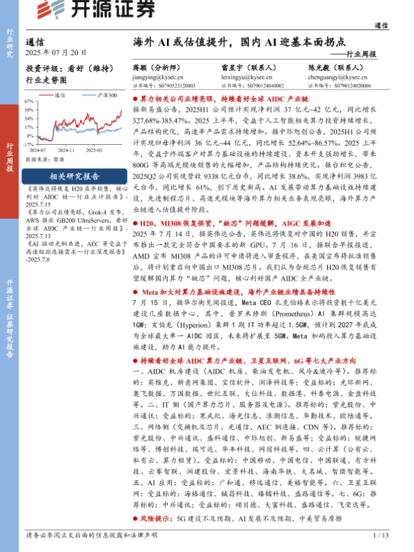 【开源证券】【20250720】通信行业周报:海外AI或估值提升,国内AI迎基本面拐点-13页 行业研究