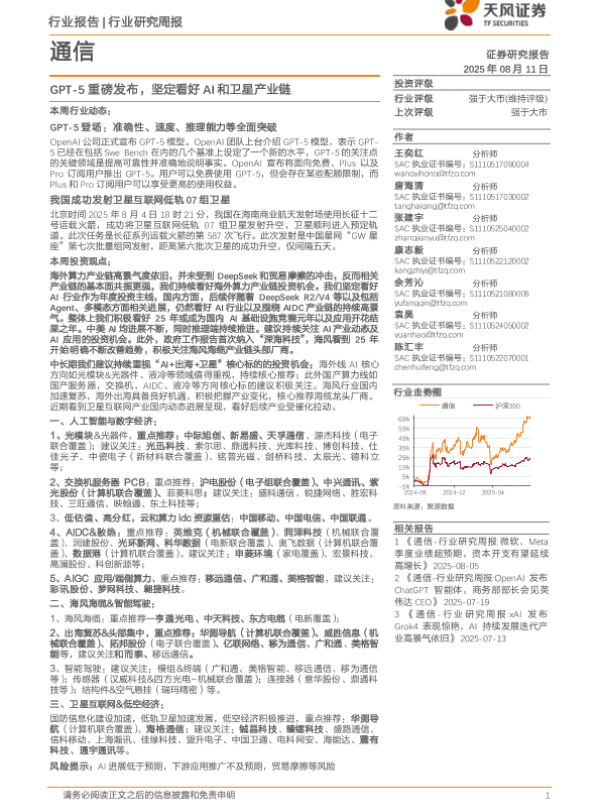 【天风证券】【20250811】通信行业:GPT-5重磅发布,坚定看好AI和卫星产业链-11页 行业研究
