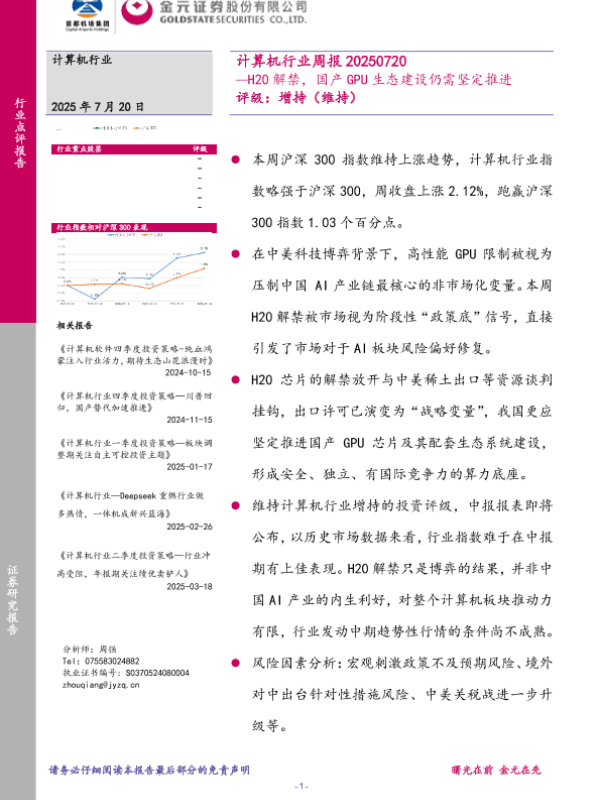 【金元证券】【20250720】计算机行业周报:H20解禁,国产GPU生态建设仍需坚定推进-16页 证券期货研究报告