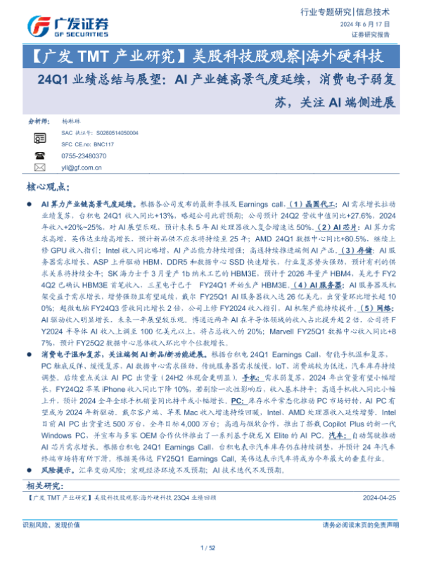 【广发证券】【20240617】美股科技股观察|海外硬科技行业:24Q1业绩总结与展望,AI产业链高景气度延续,消费电子弱复苏,关注AI端侧进展-52页 行业研究