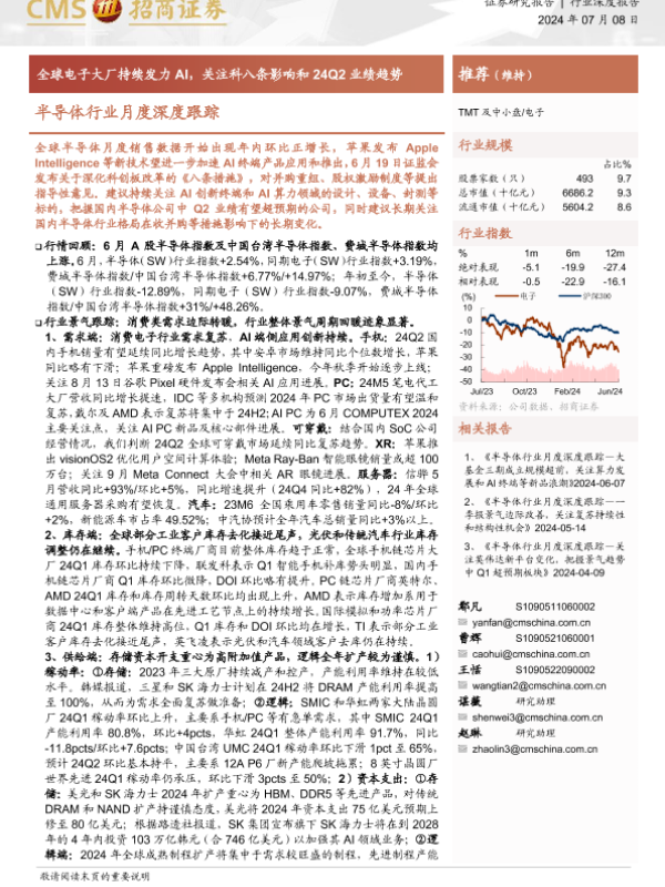 【海通证券】【20240708】20240708-招商证券-半导体行业月度深度跟踪:全球电子大厂持续发力AI,关注科八条影响和24Q2业绩趋势-81页 行业研究