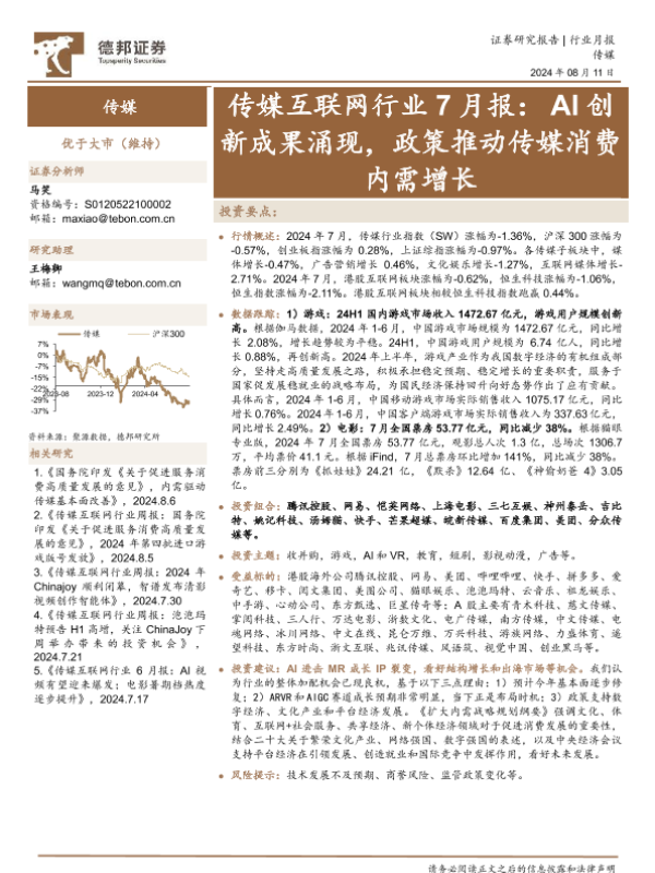 【德邦证券】【20240811】传媒互联网行业7月报:AI创新成果涌现,政策推动传媒消费内需增长-12页 行业研究