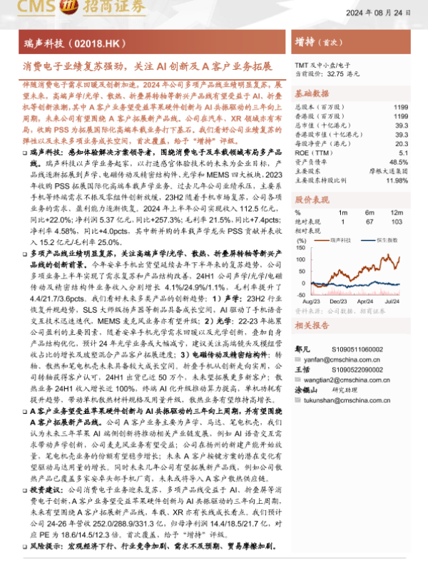 【海通证券】【20240824】瑞声科技(02018.HK)消费电子业绩复苏强劲,关注AI创新及A客户业务拓展-22页 行业研究