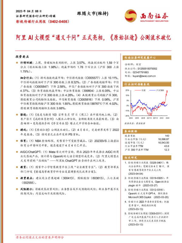 【西南证券】【20230408】影视传媒行业周报:阿里AI大模型“通义千问”正式亮相,《原始征途》公测流水破亿-19页 行业研究