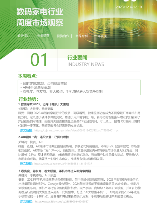 【艾瑞咨询】【20231210】2023年第50周:数码家电行业周度市场观察-4页 行业研究
