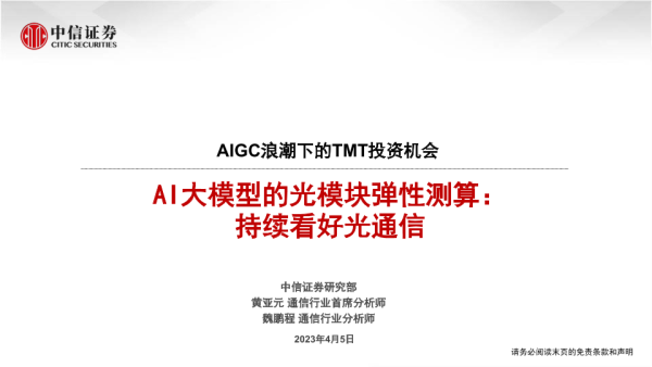 【中信证券】【20230405】2023年07月15日更新-通信行业AIGC浪潮下的TMT投资机会AI大模型的光模块弹性测算持续看好光通信-17页 行业研究