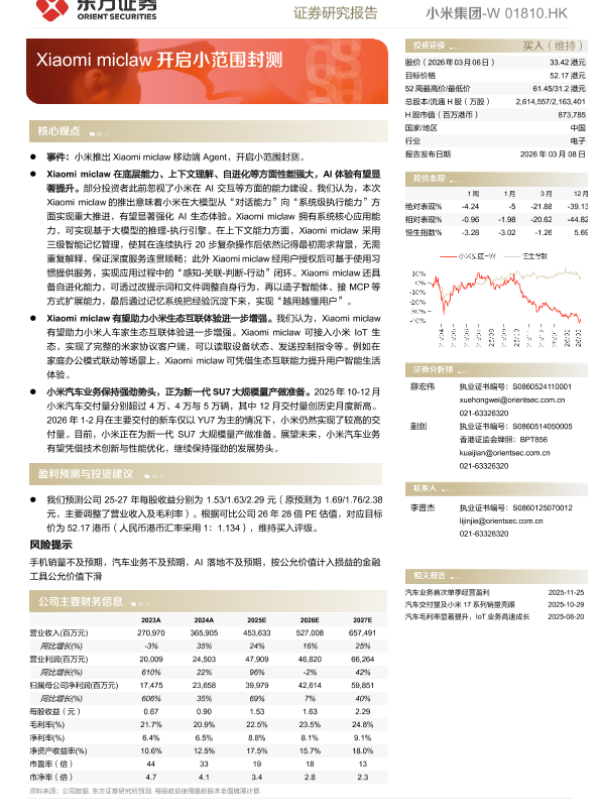 【东方证券】【202603】小米集团-W动态跟踪 —— Xiaomi miclaw开启小范围封测-5页 证券期货研究报告